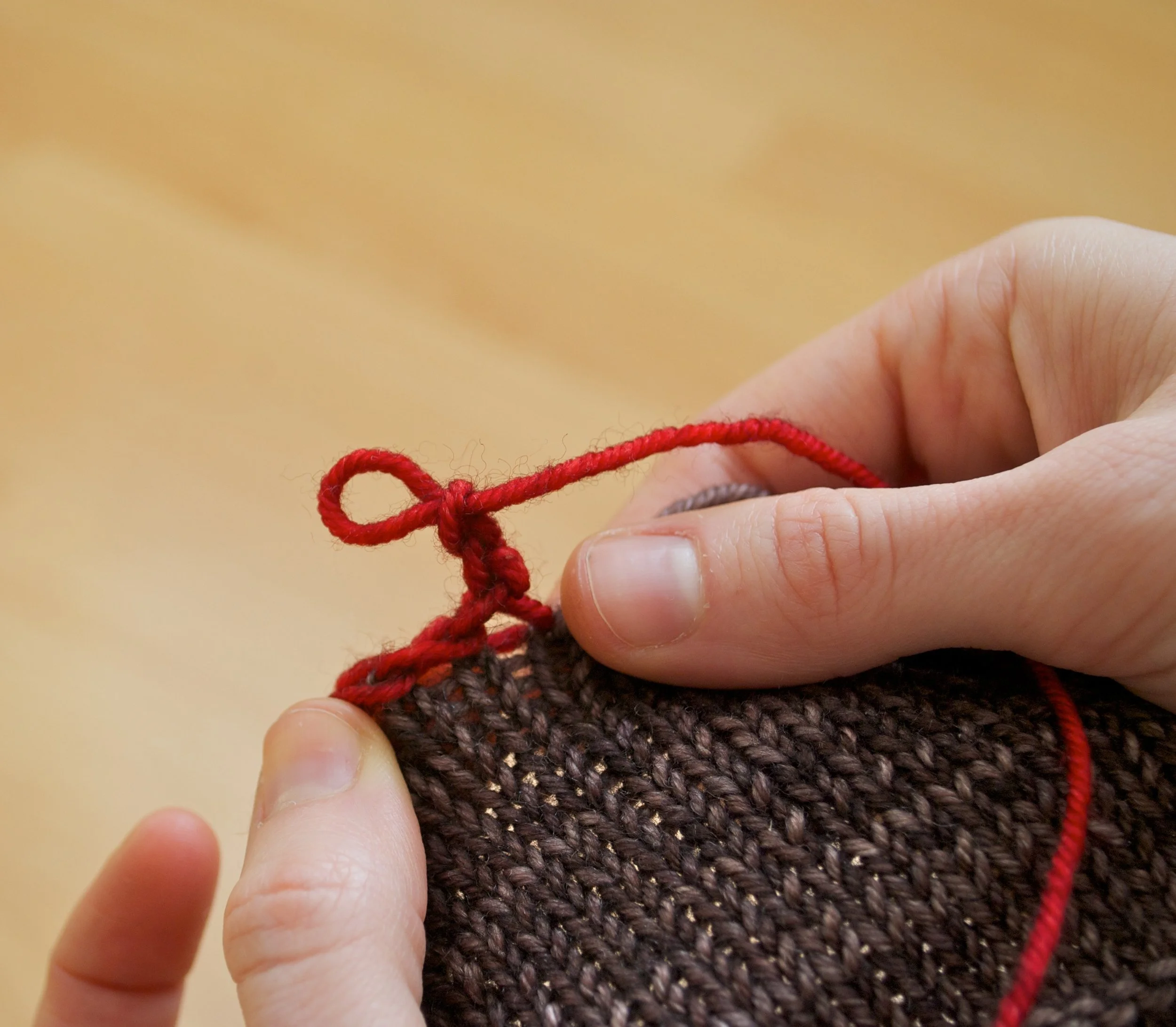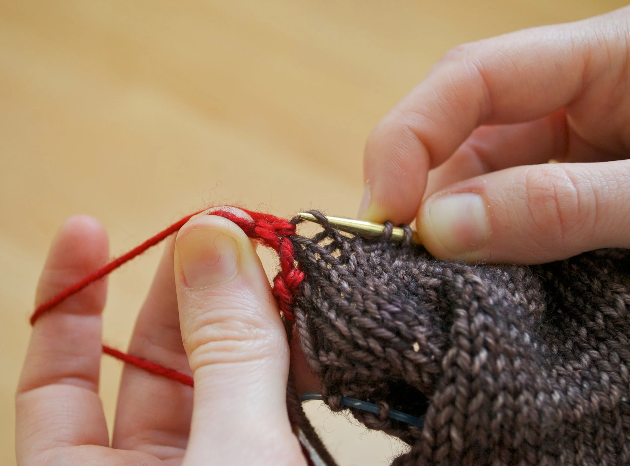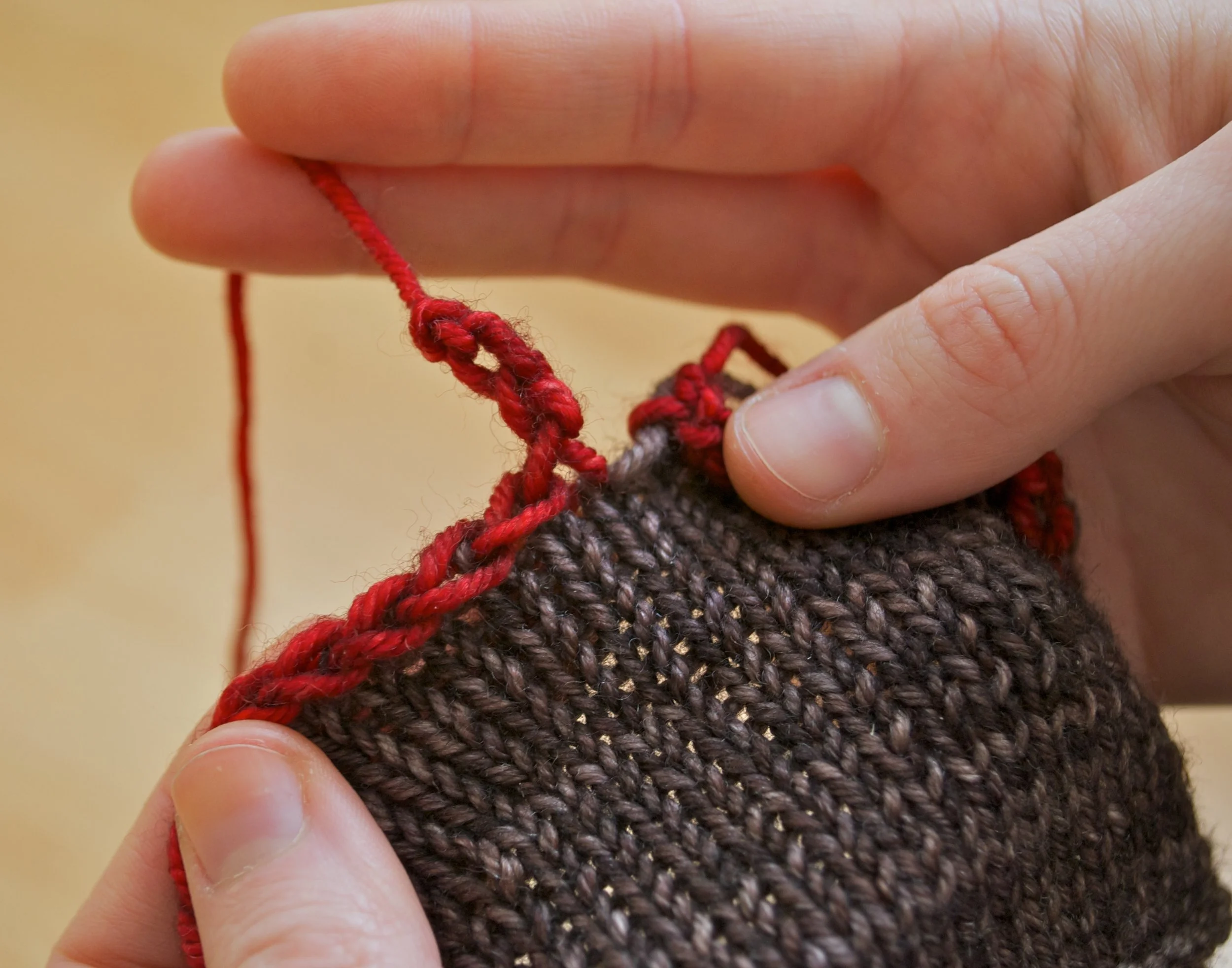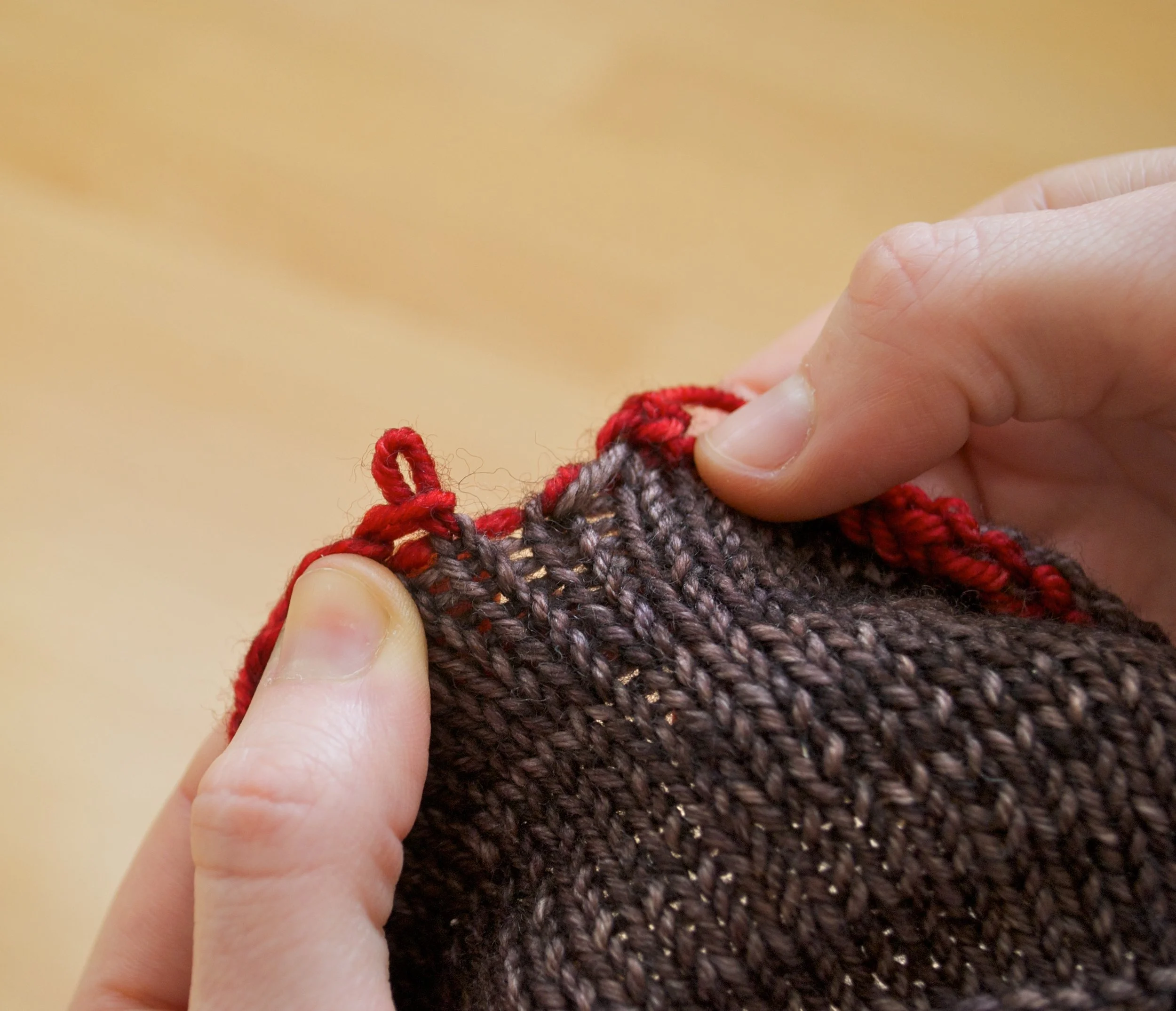Find the end of your provisional cast on with the chained stitches. This is the end to begin unraveling.